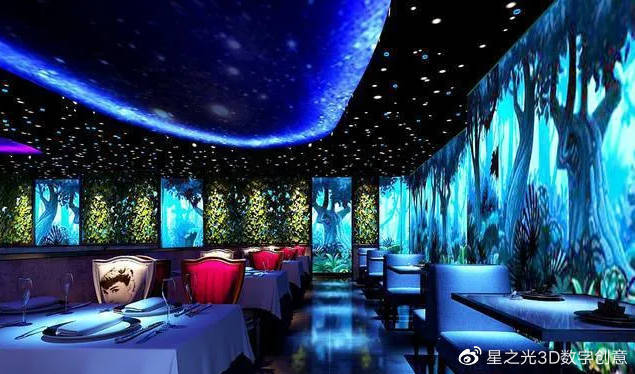 “全息餐廳”是最近幾年興起的一項新技術(shù),將全息膠片與投影機技術(shù)結(jié)合,然后將畫面中的內(nèi)容進行還原,形成全息影像,被稱為“沉浸式”、“全息餐廳”、“三維全息沉浸式”、“3D全息餐廳”。