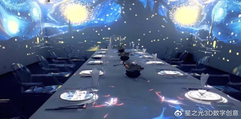 全息餐廳采用全息交互投影技術,在地面、墻壁、桌面等介質上投影出3D題材的場景,并與動作捕捉、影像融合等技術,營造出一種“沉浸式”的交互式體驗??赏ㄟ^控制終端進行主題場景的切換,非常有趣。