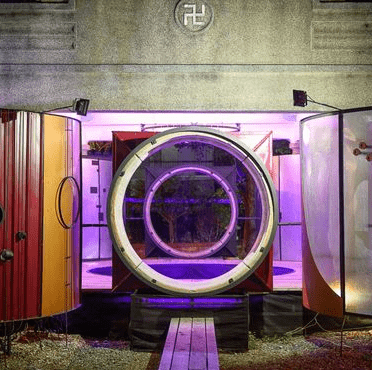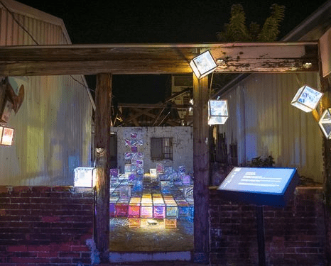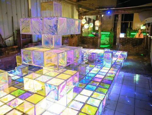 走進(jìn)廢墟裡,地板整齊排列著繽紛的方塊,這些方塊體看起來是用玻璃紙去設(shè)計(jì)的,摸起來輕薄,所以不可以坐在作品上。冰晶方塊魅力四射,再搭配燈光的照射,滿分覺得好像來到璀璨的冰晶殿堂,月之故事館的幻彩結(jié)晶也非常受歡迎。